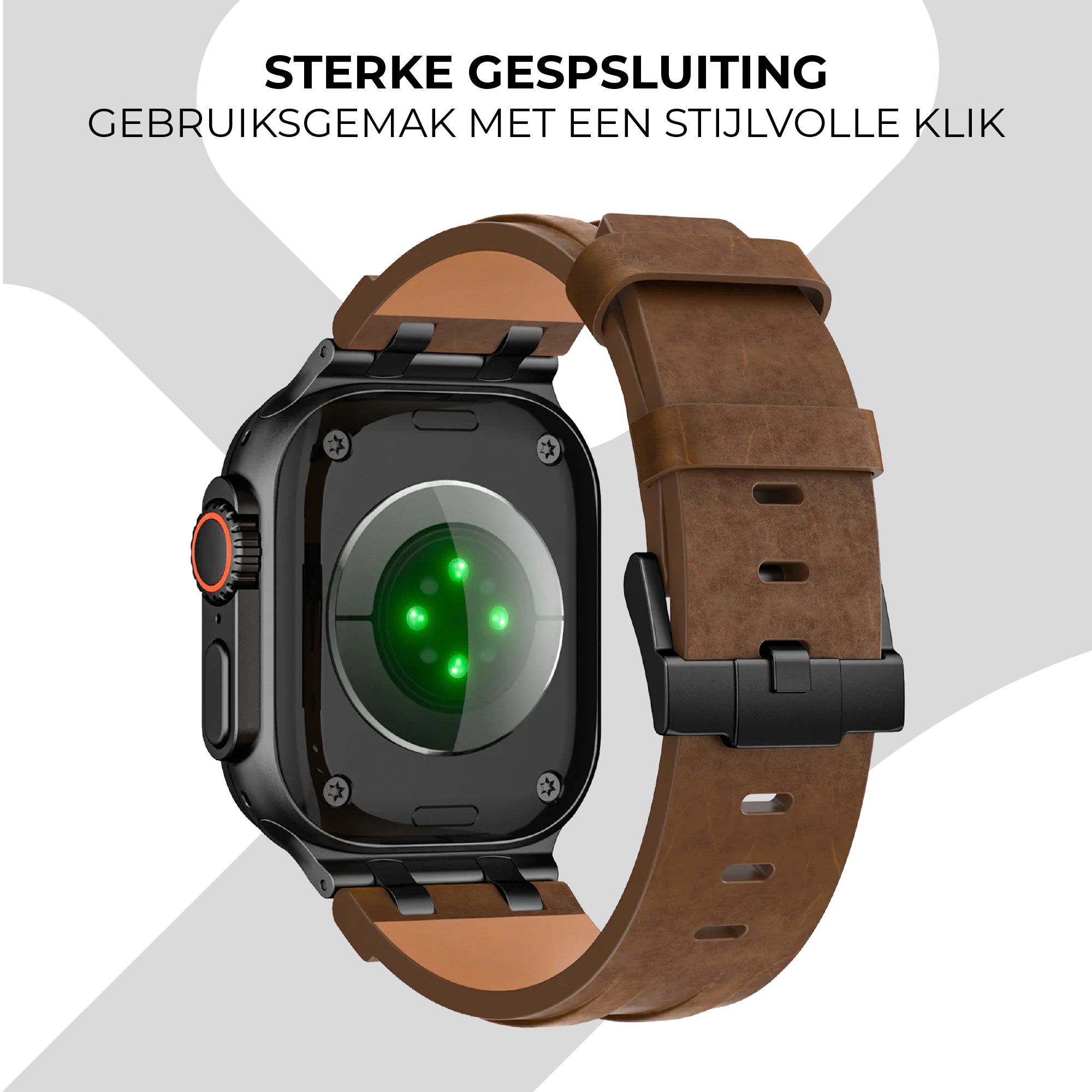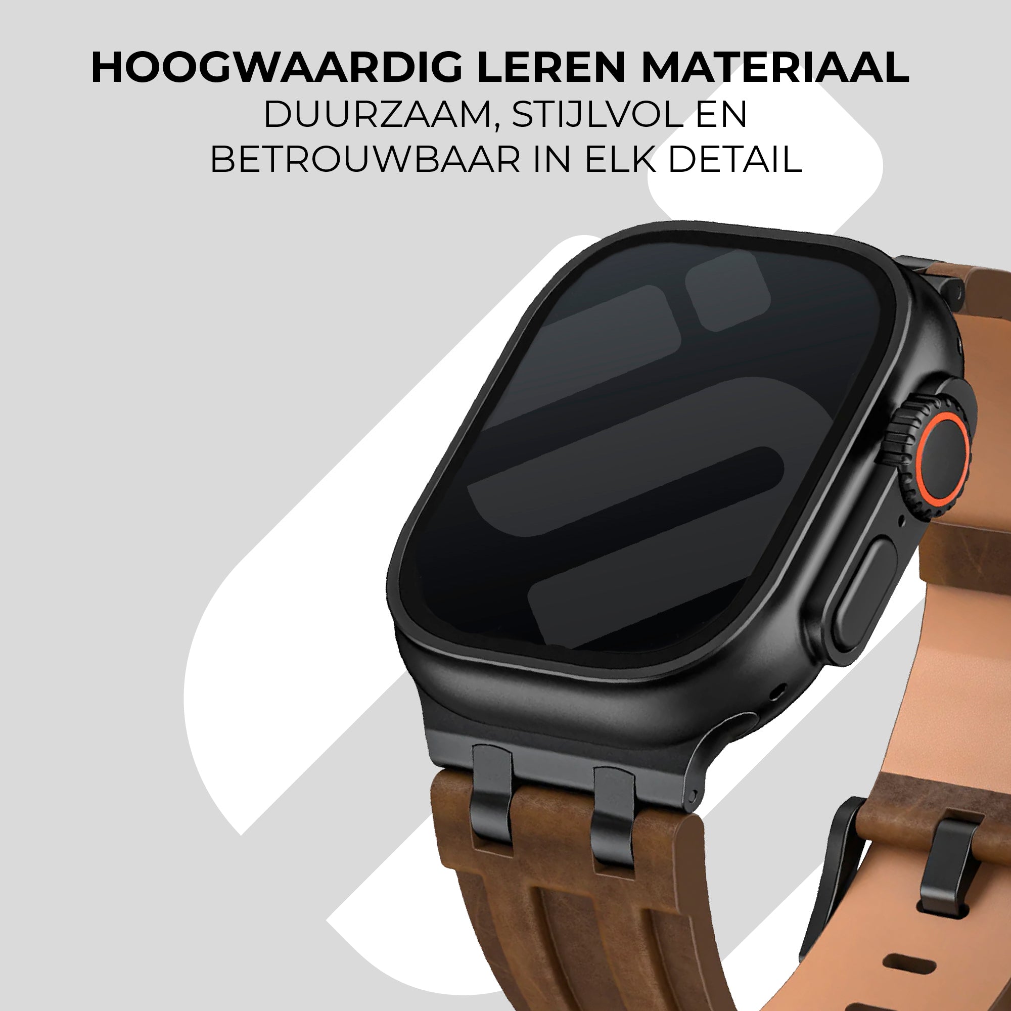 Deze luxe lederen band is alleen verkrijgbaar voor de grote maten van de Apple Watch, namelijk de Ultra (49mm), 44mm van de SE series en 6 series, 45mm van de 7, 8 en 9 series en 46mm van de nieuwste series 10 en 11. Je kunt jouw maat vinden aan de achterzijde van de iWatch kast .