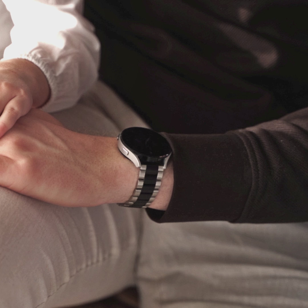Verfraai je smartwatch met deze stijlvolle stalen band met zilveren en zwarte afwerking.